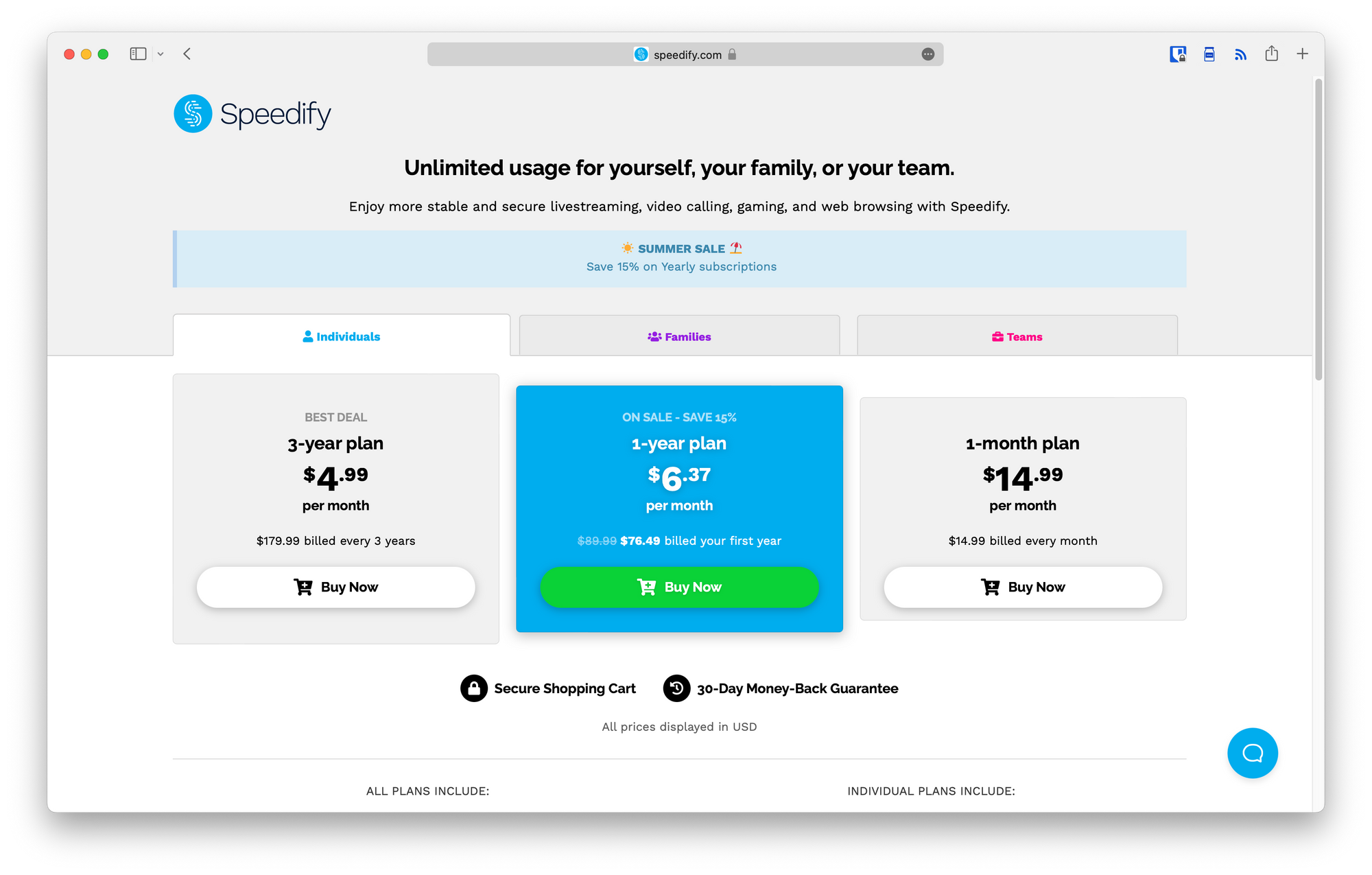 Speedify for one user? I would totally go for team plan! For one year it's the same price and you get some benefits over the individual plan. I notice the difference looking into the dedicated server feature. It's upsold feature, not included out-of-box in any plan. If you may need it in the future, make sure to choose Teams offer, because that feature is not even available in Individual plan.